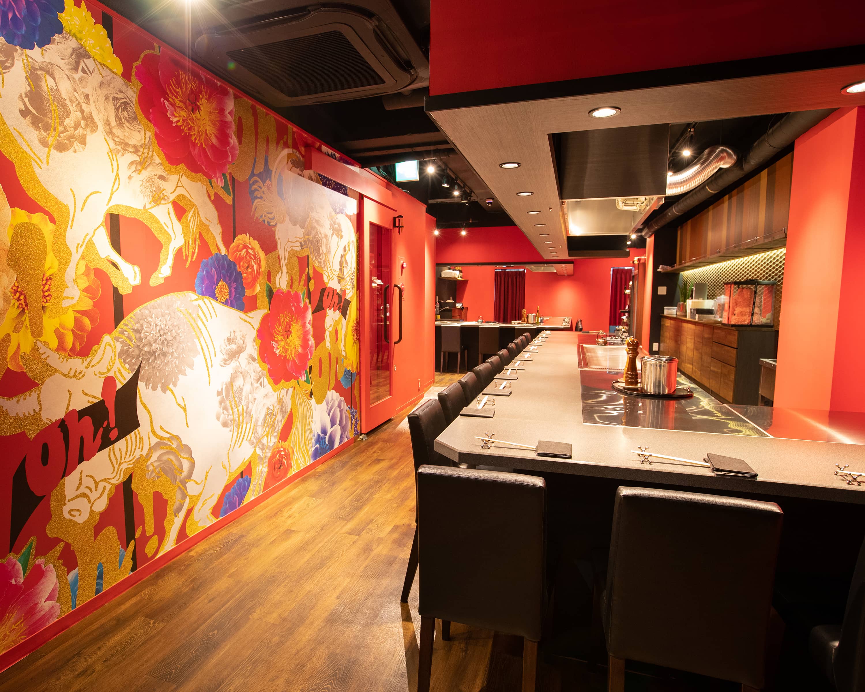 心斎橋エリアの中心地。 オープンカウンターと赤い牛のデザインが特徴のお店です。