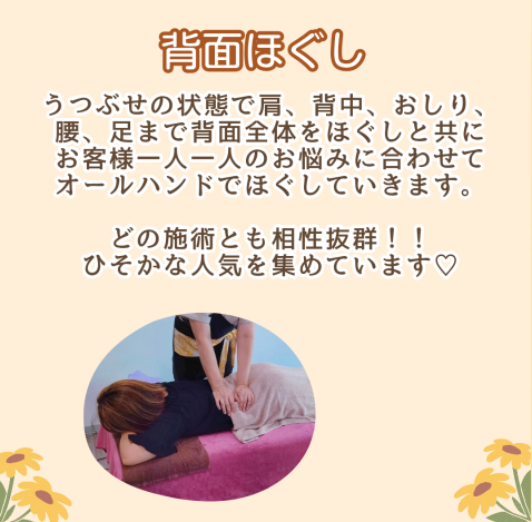うつぶせの状態で肩、背中、おしり、腰、足まで背面全体をほぐしと共にお客様一人一人のお悩みに合わせて、オールハンドでほぐしていきます。