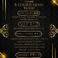 《予約必須》【¥6,500 B-コース】◆ビリヤニビーフ、サヤデヤシュリンプなどの5品から選べる一品、スープ、ファラフェル、フムス、デザートなどが楽しめる《プラス料金で飲み放題のプラン、滞在時間変更可