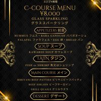 《予約必須》【¥8000 C-コース】ビーフサーロインやグリルウズラなど豪華3品から選べる、スープ、ファラフェル、フムス、タジン、バクラヴァなどが楽しめるプラス料金で飲み放題のプラン、滞在時間変更可