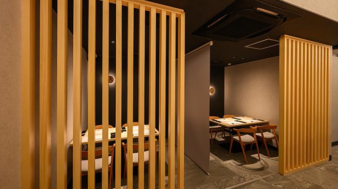 店内は高級感を保ちつつも落ち着きもあり、檜の一枚板を使用したカウンター等洗練された空間が特徴。