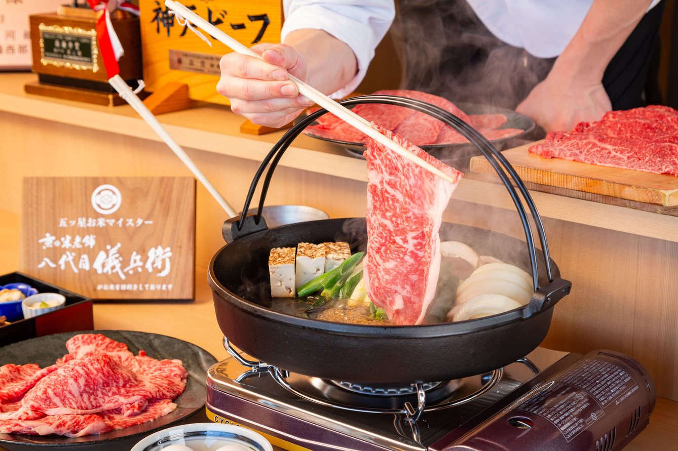 目の前で切り出す神戸牛のすき焼きをお愉しみいただけます。