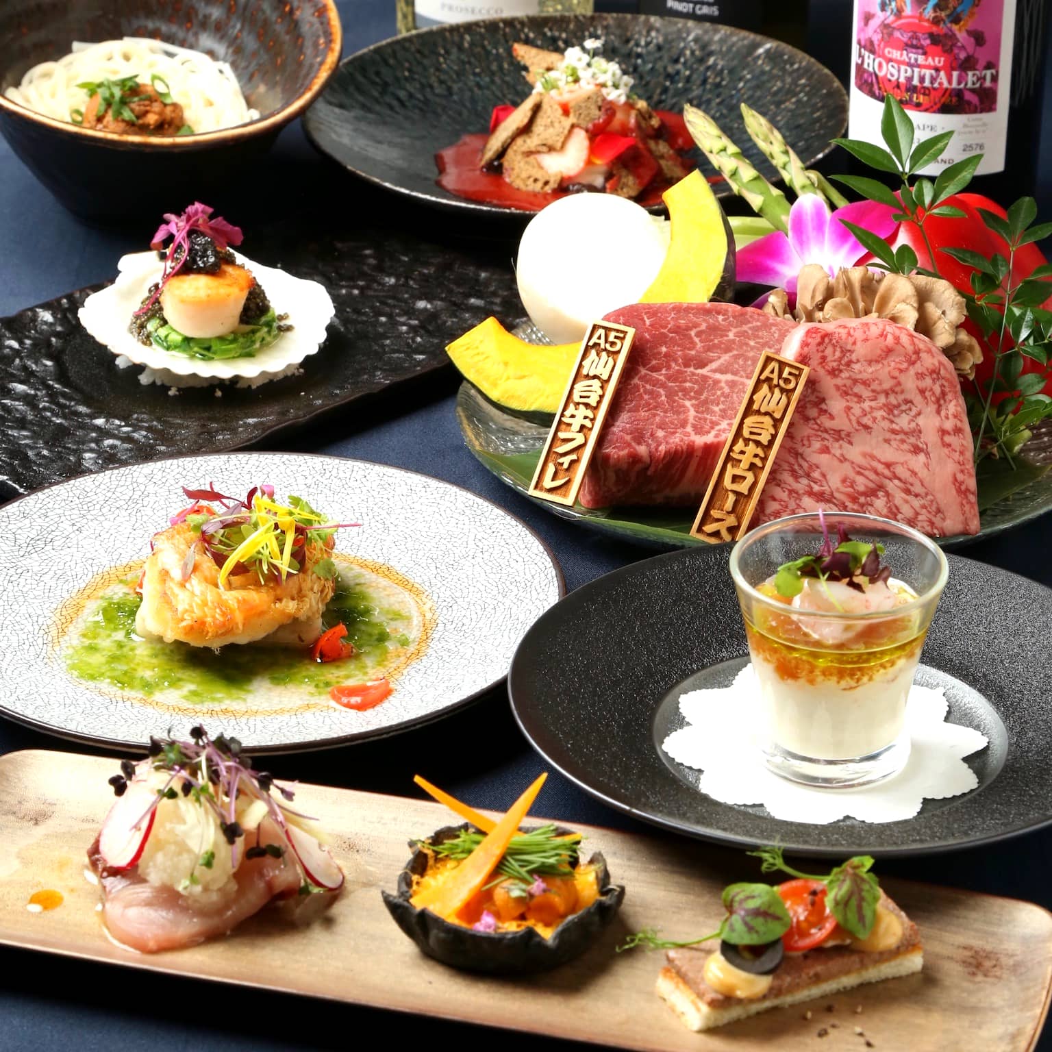 - 前菜3種、メイン、デザートなど全8品。雲丹や帆立、キャビアや、A5仙台牛ロース50g、フィレ40gの食べ比べで仙台牛の上質な肉の旨味をご堪能ください。また、ソムリエがお料理に合わせてセレクトしたペアリングワイン(4種)+4,800円(税込)、ノンアルペアリング(4種)+4,000円(税込)でコース料理に追加が可能です。大切な方との記念に残るお食事をお楽しみください。※コースは120分制